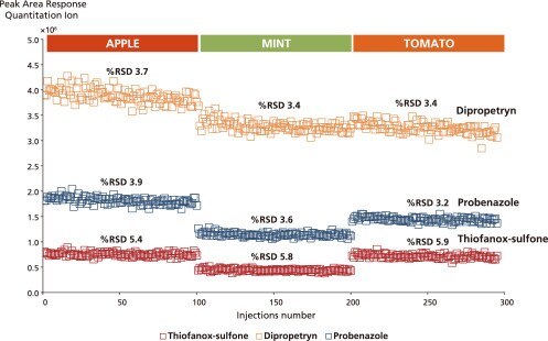 Peak area response for three pesticides spiked into apple, mint and tomato matrix extracts at 0.05 mg/kg over 72 hours.