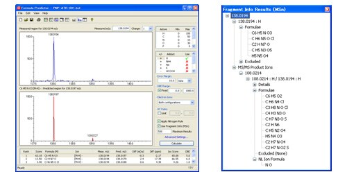The workflow for the process from impurities detection to formula/structure prediction is significantly accelerated by two pieces of software: MetID Solution, which uses the similarity of the MSn spectra to automatically extract peaks with structural relativeness to API; and Formula Predictor, which not only uses mass accuracy for structure estimation but combines isotope pattern scoring, chemistry rules, and MSn filtering.