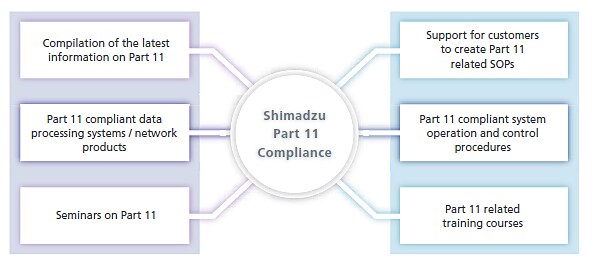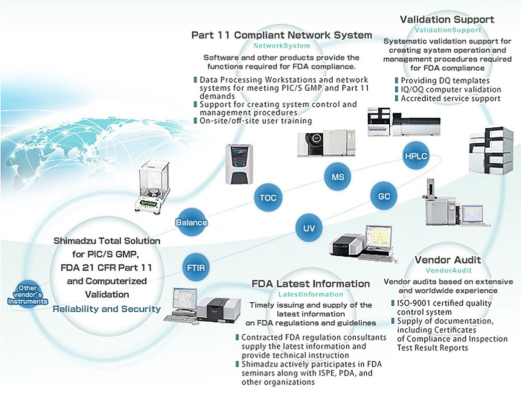 All Shimadzu network system products incorporate functions for the PIC/S GMP and the Part 11 compliance regulation, and computerized system validation functions required by GxP. Shimadzu provides documentation including IQ/OQ, Certificates of Compliance, and Inspection Test Result Reports based on Shimadzu IS09001 certified system. Shimadzu's accredited service personnel offer full support for validation of customer's Shimadzu products. In the latest information on PIC/S and FDA regulations through seminars and workshops, participating in vendor audits demanded by agencies, and actively assisting customers to comply with new regulations.