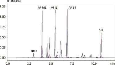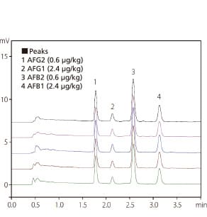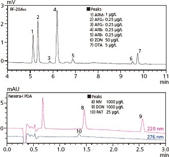 Simultaneous analysis of mycotoxins is important because multiple mycotoxins have been detected in a single food and may cause a synergistic effect. From this background, simultaneous analytical methods have been developed. Shown below are chromatograms of direct analysis of aflatoxins without any derivatization and rapid screening of 10 mycotoxins using HPLC.