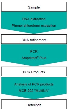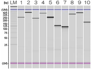 The results of analysis using the MCE-202 MultiNA were obtained as electrophoretic images and electropherograms. The estimated size and concentration values for the amplification products were calculated from the calibration curve for the standard sample (ladder) and expressed as numeric values, allowing simple and reliable evaluation of the target amplification products.