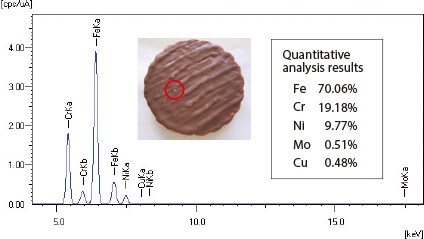 An energy-dispersive X-ray fluorescence (EDXRF) spectrometer permits the easy and rapid identification of inorganic foreign matter adhering to, or mixed into, food products. Below is an example of the qualitative analysis of a metal fragment on chocolat