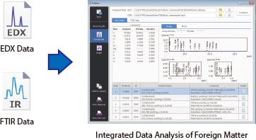 EDXIR-Analysis software is specially designed to perform an integrated analysis of data from FTIR and EDX. The library used for data analysis (containing 485 data as standard) is original to Shimadzu.
