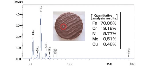 The energy dispersive X-ray fluorescence spectrometer (EDX) permits the easy and rapid identification of foreign matter adhering to or mixed into food products, pharmaceuticals, and other products. This shows an example of the qualitative analysis of a metal fragment on chocolate.