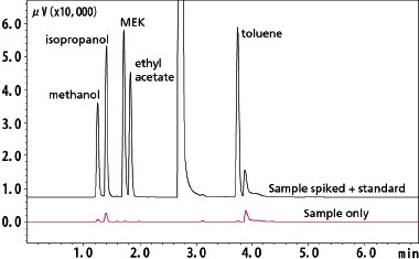 Quality control of residual organic solvents is required because the manufacture of food packaging materials and containers involves the use of organic solvents in printing inks and adhesives. This example shows analysis of residual organic solvents in dry snack packaging using headspace GC. Trace residual solvents were detected.